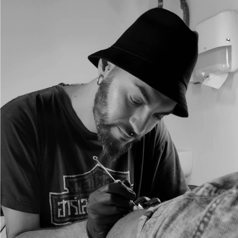 Tom, aka scalp_hell. Artisan tatoueur polyvalent. Je m'adapte à toute demande tout en cherchant à créer des projets uniques et originaux pour tous les goûts. J'ai aussi mon travail perso' principalement orienté vers le dotwork très contrasté pour les dessins figuratifs et le heavy blackwork pour les dessins abstraits et graphiques. Je trouve mon bonheur dans l'action du tatouage, pas exclusivement dans les motifs. J'ai l'air méchant mais suis très doux, malgré mes vieilles machines qui font du bruit.